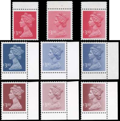 c. 1990s Enschede photogravure £3 (PCP/PVA) graduated colour trials (from dark to pale and graduated) in red, blue and red-brown, mint unmounted o.g., a scarce group.