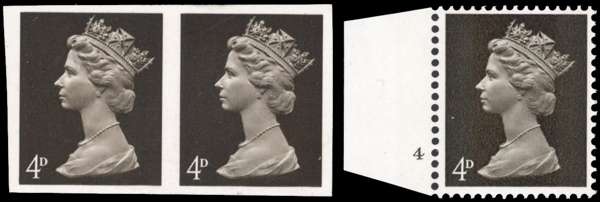 1967 4d deep sepia (Head A, OCP/ Gum Arabic, without phosphor) imperforate horizontal pair, from the 3rd trial where the face value was relocated from the right of the Queen's head to the left. Mint unmounted o.g., minute thin in top right margin, still very fine and rare, one of only three pairs in private hands! Offered with issued stamp for comparison. SG 731var