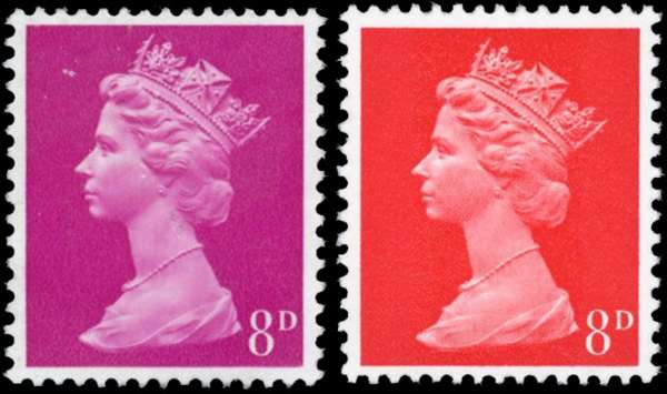 1967-70 8d ‘Cambridge’ colour trial (OCP/PVA) in unadopted deep magenta (a similar colour to the decimal 3p SG X857) unused without gum, otherwise fine, rare. Offered with normal 8d bright vermilion for comparison. SG 738var