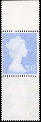 1970 50p deep ultramarine (Post Office paper/PVA) top marginal vertical pair, with top stamp showing near complete offset on reverse, mint unmounted o.g.; small natural paper inclusion, otherwise fine, a very striking item. SG 831