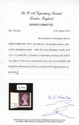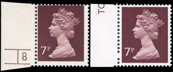 1977 7p purple brown, leftmarginal (showing cylinder no.8 no dot) error of paper, printed on phosphor-coated paper (PCP/PVA), mint unmounted o.g. very fine and rare, only a handful of examples are thought to exist in private hands. Offered with normal FCP example for comparison. BPA Certificate (2010). SG X875; Connoisseur No. CC152AOP