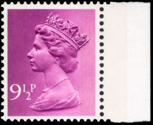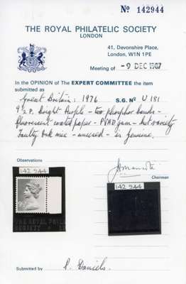 1976 9½p bright purple-magenta (FCP/PVAD, two bands) right marginal error of colour, caused by the use of the wrong ink solvent contaminating the cylinder, mint unmounted o.g. very fine and rare. RPS Certificate (1987) SG X884; Spec.U181(2), £2,500