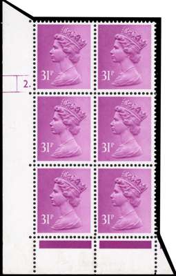 1983 31p purple (PCP/PVAD) in cylinder 2 dot, block of six, showing variety 17 pin perf, mint unmounted o.g. lower left margin with crease, otherwise fine and very rare on this value. SG X981; Spec. U323b, £4500