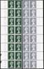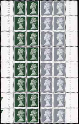 1997 undenominated Machin ‘Courvoisier Swiss’ photogravure trials on granite paper, comprising two imprint marginal blocks of sixteen (2x8) in deep green (2p) and light grey (29p) mint unmounted o.g., very fine and scarce in such positional form. SG Y1668, Y1693