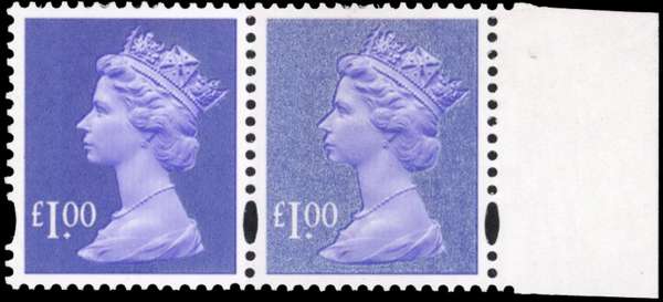 1995 £1 bluish violet (NFCP/PVA) right marginal horizontal pair, showing Iriodin security (silver) overinking flaw, affecting the right stamp (this thought to have occurred in c.2005, only affecting the far right column of one sheet) mint unmounted o.g. fine and scarce, one of twenty-four examples believed to exist. SG Y1743