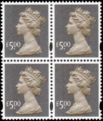 2003 De La Rue £5 colour trial in unissued brown iriodin security ink (PCP/PVA), mint unmounted o.g. block of four, fine and scarce. SG Y1803