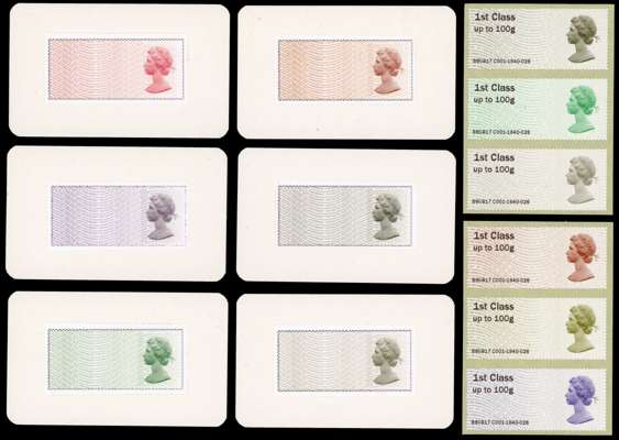 Post & Go. 2017 Machin Anniversary 1967-2017, set of six stamp-sized photographic proofs, mounted on white card (85x53mm) in near issued colours, fine and scarce, offered with the issued strip for comparison. SG FS179-184