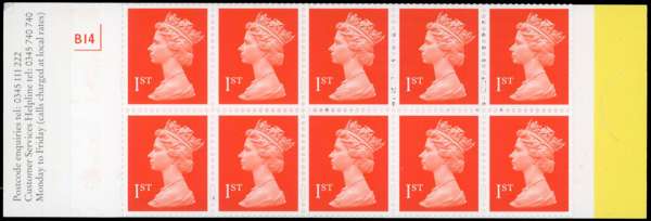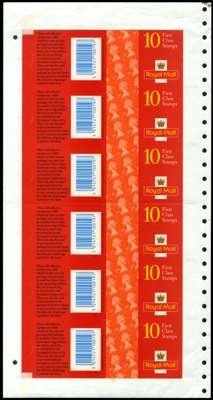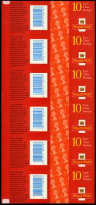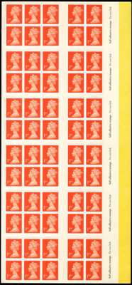 1997 Harrisons/De La Rue 1st bright orange-red, (NCFP/SA) self adhesive booklet trials comprising an uncut perforated sheet of 60 (in panes of six and four, for booklets of 10) on booklet backing, and semi-finished booklet trial with the outer selvedge removed, mint, some horizontal folds, otherwise very fine and rare, unique in this form. Offered with issued booklet of x10 1st class (SG HD39) for comparison. SG 1667/ HD39