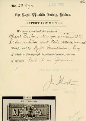 I.R. Official. 1882-1901 £1 brown-lilac (ND) mint, large part o.g., short perf at top and vertical crease at right, nevertheless an attractive example of this departmental rarity. RPS Certificate (1942). SG O12, £85,000