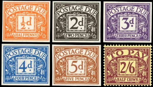 Postage Dues. 1954-55 imprimatur set of six, unmounted o.g., the 2s6d perforated 15 x 14, the balance imperforate. Each handstamped NPM IMPRIMATUR on reverse. Very rare, one of only five sets released from the NPM archive. SG D40-5