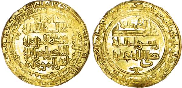 Abbasid, al‑Nasir (AH 575‑622 / 1179/80‑1225 AD), gold Dinar, AH 614 / 1217/8 AD, Madinat al‑Salam, 7.87g (A. 268). Extremely Fine, minor weakness, with traces of original lustre. Extremely rare.