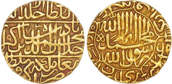 India, Mughal Empire, Akbar (AH 963‑1014 / 1556‑1605 AD), gold Mohur, AH 973 / 1565/6 AD, Agra, 10.80g (KM 105.1). Good Very Fine, beautiful large flan.