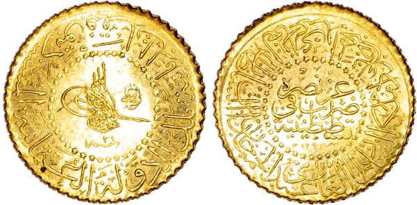 Ottoman Empire, Abdul Hamid II (AH 1293‑1327 / 1876‑1909 AD), gold 25 Kurush de Luxe, AH 1293 (frozen year), year 21, 1.83g (Fr. 150). Extremely Fine.