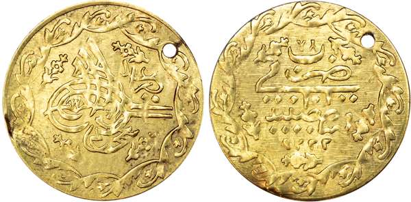 Ottoman Empire, jeweller’s copy of gold Cedid Mahmudiye, AH 1222, 1.05g. Very Fine, pierced, sold as seen, no returns.
