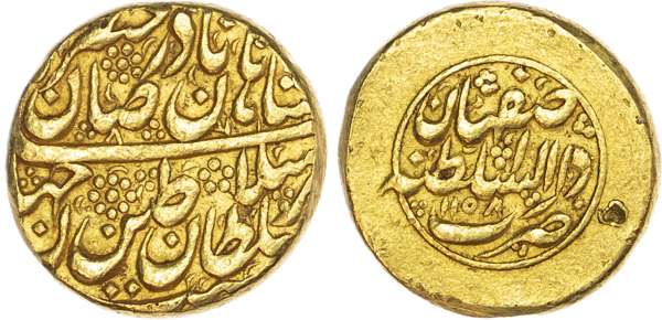 Afsharid, Nadir Shah (AH 1148‑1160 / 1735‑1747 AD), gold Mohur, AH 1158 / 1745 AD, Dar al‑Sultanat Isfahan, 10.92g (A. 2739.1). About Extremely Fine, test mark and edge filed on the bottom of the reverse. Scarce.