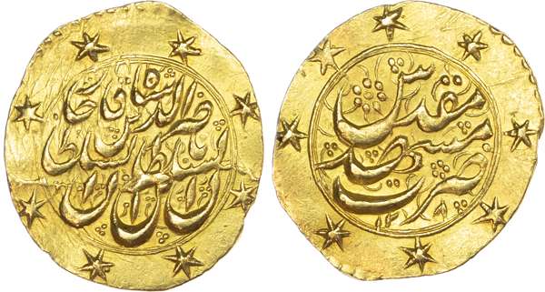 Qajar, Nasir al‑Din Shah (AH 1264‑1313 / 1848‑1896 AD), gold Toman, AH 128x, 3.42g (A. 2921). Extremely Fine, interesting die break to obverse.
