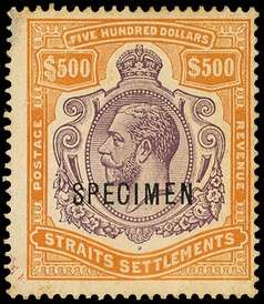 1912 $500 purple and orange-brown overprinted SPECIMEN Type D12, toned o.g. with some foxing; centred right. SG 215s,...