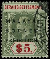 1922 $5 Malaya-Borneo Exhibition used with Singapore Registered cancel (Proud R21) and part of another CDS at top right. ...