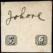 1891 series Die Proof of the 6c value tablets, cut to stamp size, with manuscript 'Johore' at top (in the distinctive hand of the other 1891 proofs). For SG 26