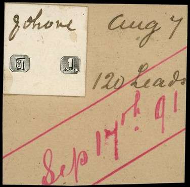 1891 series Die Proof of the $1 value tablets cut to stamp size and mounted on thin card from the printer's record book, the proof with manuscript 'Johore' at top. The piece inscribed 'Aug 7 120 leads', crossed through in red with date Sep 17th 91. For SG 27