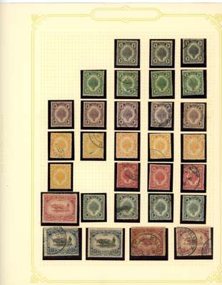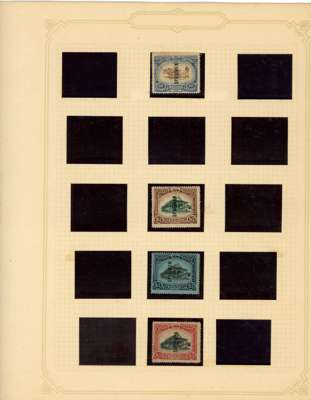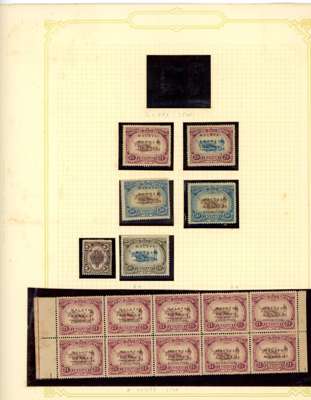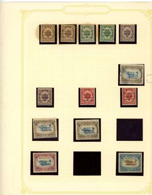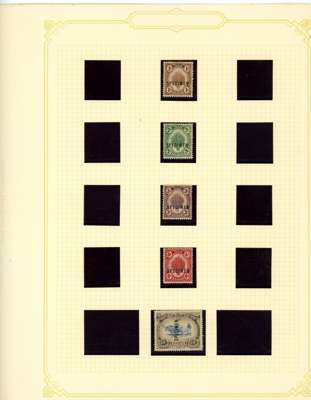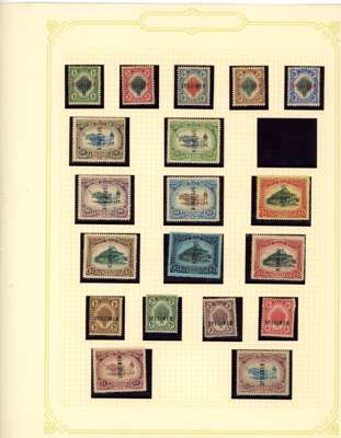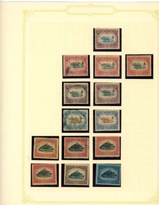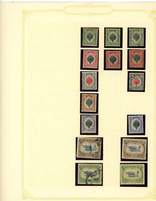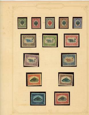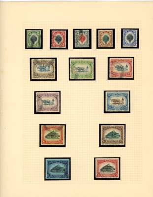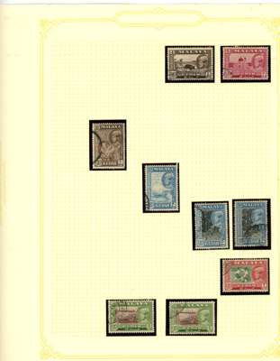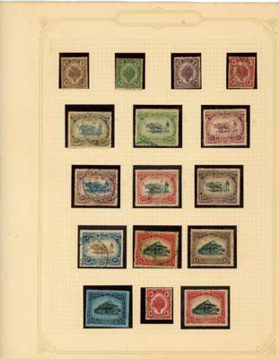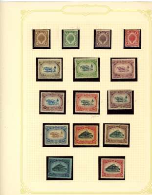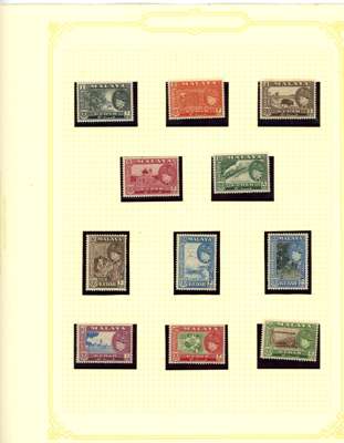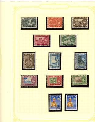 1912-62 mint, used and Specimens collection on leaves, almost complete mint to 1949 for basic stamps (lacking only the 1921 $5 Script) but these mostly with brown gum. Mixed used with the 1912 set faked cancels, the 1921 $ values dubious at best and the 1937 $5 faked cancel as usual (also the Malaya-Borneo 10c with 'feather' variety). Specimens with 1912 set less 30c, 1919 set, 1921 set less 30c and $1, 1937 set, gum generally brown. A few Malaya-Borneo varieties noted