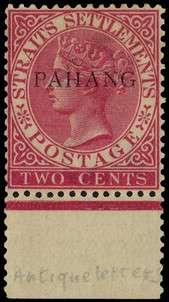 1889 Straits 2ct bright rose, large part slightly toned o.g., lower marginal with PAHANG in antique letters. BPA Certificate (1948). SG 4ab, £1100