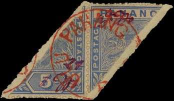 1897 2c and 3c each on half of 5c blue, the Kuala Lipis manuscript provisional, divided diagonally; a se-tenant horizontal pair on piece with undated Ulu Pahang CDS in red. Very attractive. SG 18b, £1100