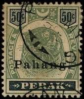 1898 50c green and black overprinted on Perak, fine used with two part CDSs. SG 22, £425