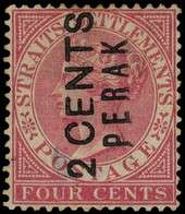 1883 2c on 4c rose surcharged PERAK 2 CENTS Type 12, unused without gum. Thinned on reverse. An extremely rare stamp,...