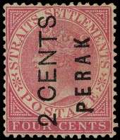 1883 2c on 4c rose overprinted PERAK Type 9 and surcharged 2 CENTS Type 13, unused without gum. SG 16, £750