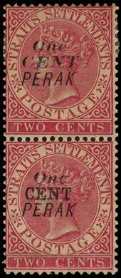 1889 1c on 2c pale rose vertical pair, the upper stamp surcharge Type 32 with large part o.g., the lower stamp Type 35 with full o.g. The gum is toned. SG 35, 38, £735