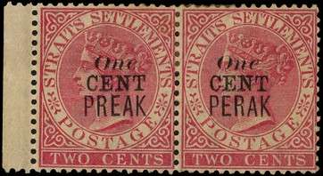 1889 1c on 2c pale rose o.g. pair with sheet margin at left, surcharge Type 32, R6/1 with PREAK error. Gum very toned but...