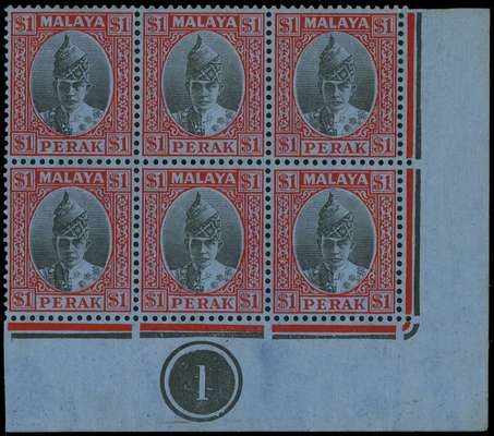 1938-41 $1 black and red on blue paper Plate 1 block of six from lower right corner, unmounted o.g., fine with the normal slightly streaky gum. SG 119, £900
