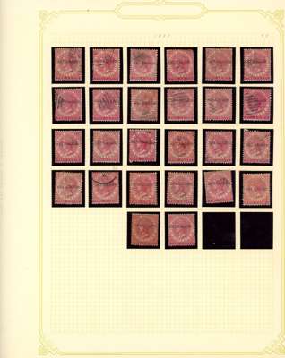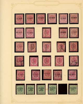 1881-1891 duplicated balance collection (60 plus 68 examples of SG 35, mostly used) on leaves, mint, unused without gum and used. Includes (o.g. unless stated) SG 2 (thinned), 3 (2) and used, 9, 11, 12 unused and used, 13 (3 used), 18, 19, 20 unused, 21 unused and used, 22, 22 unused, 23 (2), 24, 25, 24-25-23 strip (23 thinned), 28 (2), 29, 37 (gum traces, pink line on reverse), 44-8. All the mint must be assumed to have brown gum, discoloured hinge remnants, etc,, and viewing is strongly advised