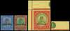 1921 $1, $3 and $5 overprinted SPECIMEN Type D12 o.g., the $3 with hinge remainder at the side, the $5 a top left corner example, with (separated) adjoining piece of selvedge completing the Plate number. SG 23s-25s, £225