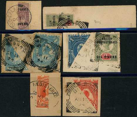 1892-4 bisects on piece, offered on their merits. 1892 1d right half with Old Calabar River CDS of OC 18 93; 1892 2d right half with part Bonny squared circle; 1894 1d pale blue lower left half with whole stamp, Bonny squared circle cancels SP 11 94; 1894 1d dull blue upper left half on piece with Oil Rivers 2d, Bonny squared circle cancels of AU 12 94; 1894 1d orange-vermilion left half (unlisted vertical bisect), 15 JY oval registered cancel; ½d vermilion upper right half, Bonny squared circle AU 15 94. Toning in places
