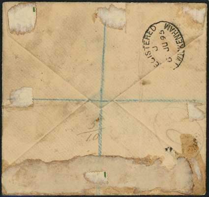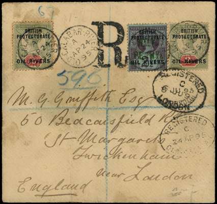 1895 registered cover to England with ½d on 2½d handstamped Type 4 in green, together with two Oil Rivers 2ds, Old Calabar River CDSs of AP 24. Soiled, some staining and creased (well clear of adhesives); the reverse with adhesions. BPA Certificate (1980). SG 3, 11
