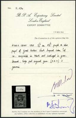 1893 ½d on 2½d handstamped Type 4 in green, large part o.g. with brown hinge remainder. BPA Certificate (1982). SG 11,...