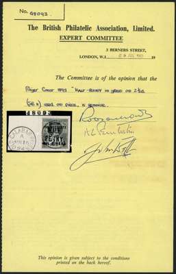 1893 ½d on 2½d handstamped Type 4 in green, fine used on piece, Old Calabar MR 16 94 CDS with another strike alongside. BPA Certificate (1963). SG 11, £275