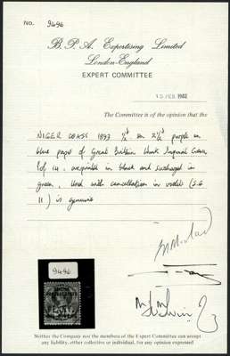 1893 ½d on 2½d handstamped Type 4 in green, fine used with Old Calabar AU 28 94 CDS. First N of PENNY has largely failed to print. BPA Certificate (1982). SG 11, £275