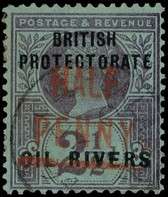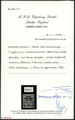 1893 ½d on 2½d handstamped Type 4 in vermilion, fine used on piece with Old Calabar JY 6 94 CDS. 120 printed. BPA Certificate (1993). SG 12, £325