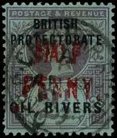 1893 ½d on 2½d handstamped Type 4 in carmine, fine used on piece with Old Calabar River CDS. 120 printed. RPS Certificate (1960). SG 13, £475
