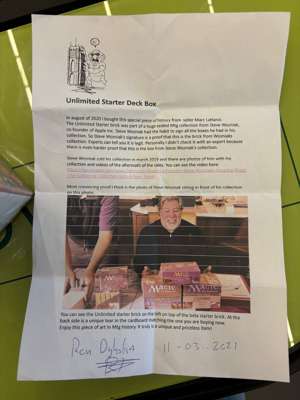 This item includes a sealed Unlimited Starter Deck Display. The item is sealed and contains 10 sealed unlimited starter decks. The items has also been signed by Steve Wozniak and comes with a letter/picture of authenticity. This highly coveted item comes consigned from one of the most reputable traders in Europe.