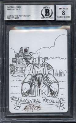 This card has a genuine Magic back and on its blank face, in addition to his signature, the incredible artist Mark Pool has created a sketch version of his iconic “Ancestral Recall” artwork. This unique work of art on an original Magic card canvas could be a truly special addition for your binder, deck, or cube.