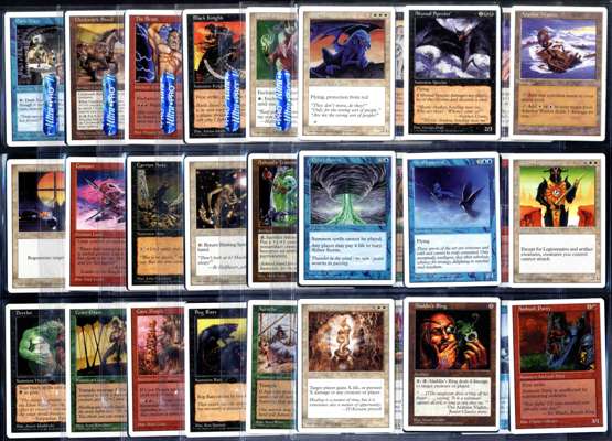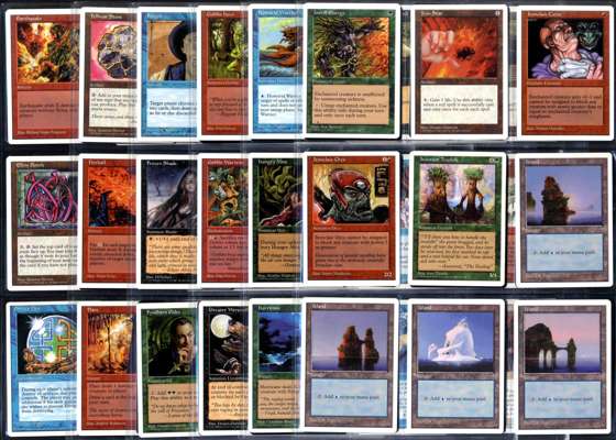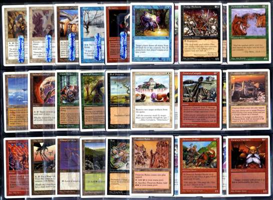 Adarkar Wastes HP, Animate Dead NM, Armageddon NM, Ashnod's Altar NM, Birds of Paradise NM, Brushland EX, City of Brass NM, Goblin King HP, Karplusan Forest EX, Mana Vault EX, Necropotence NM, Stasis HP, Sulfurous Springs DM, Sylvan Library LP, Underground River NM, Winter Orb EX, Wrath of Good GD.