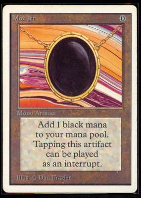 This Unlimited Mox Jet is in Played Condition. The wear present on the card is as you would expect for a card of this age and quality. The front surface is quite clean, with only a small amount of grime present. Writing indents are visible when shown to the light, however these are only impressions with no ink/pencil present.
