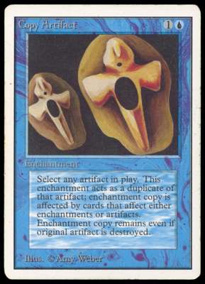 ‘Copy Artifact’ from Unlimited in Good (GD) condition. This card has some yellowing and dirt present on its border in addition to some minor wear. The surface has some scratching and very light binder dents.