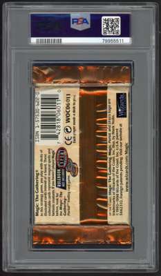 A PSA 8 graded Urza's Saga sealed booster pack, featuring the artwork from ‘Phyrexian Colossus’.