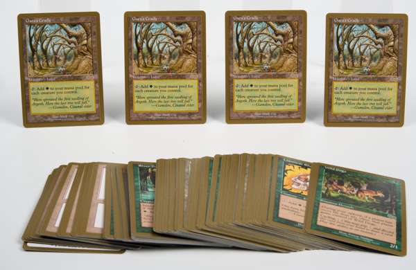 The gold-bordered version of Matt Linde’s World Championship Deck he took to Tokyo in 1999. This WCD is especially valuable as it contains x4 copies of Gaea’s Cradle, with the gold border versions being found in more and more premodern and commander decks. The deck appears virtually unused, and as such the cards are mostly in Near Mint (NM) condition. The deck also includes the original deckbox and insert/blank cards.