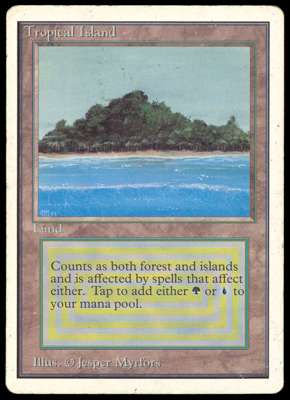 This Unlimited Tropical Island is a fantastic copy to play with, deemed in Played condition by European standards the American TCG Player equivalent would be heavy Play. The card has a chip in the top right hand corner on the back that leads into a slight fold. It also has edgewear, blemishes and dirt patches akin to what a Played card would have.